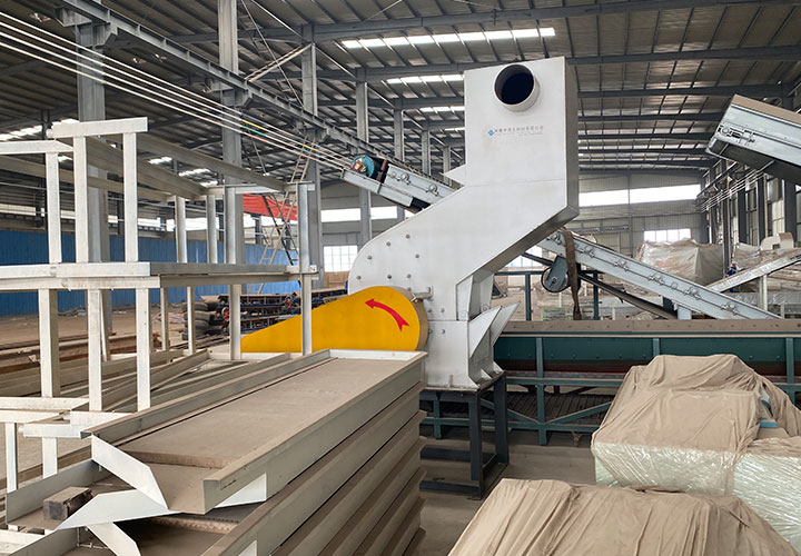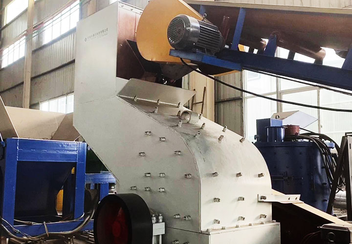 破碎線主機殼體采用特厚鋼板制造,內(nèi)襯為高錳鑄鋼件,可更換;主機轉(zhuǎn)子盤安裝于水平軸上,轉(zhuǎn)子盤圓周分布有銷軸,軸向懸有錘頭;主軸用滾珠軸承支撐,循環(huán)油強制潤滑冷卻,并裝有溫度傳感器;進(jìn)料口裝有液壓輥筒喂料裝置,位置一高一低,同向旋轉(zhuǎn),能將大件松散物料壓扁,送入破碎腔內(nèi)。